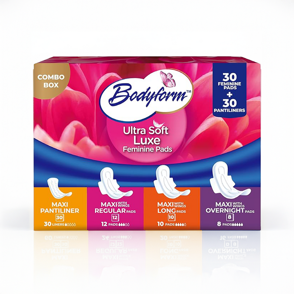 Cushion Soft Top Sheet : Our Cushion Soft Top Sheet, crafted from a specialized super soft material, guarantees a gentle and comfortable feel against your skin, ensuring you always feel fresh and dry. Enhanced Comfort and Protection: Designed to redefine your feminine hygiene routine, these pads and pantyliners combine superior softness with effective absorbency for all-day comfort and protection. Complete Bundle for All Your Needs: This generous bundle includes 30 high-quality feminine pads and 30 pantyliners, providing you with comprehensive coverage for various needs throughout your cycle. Reliable Protection on-the-go : Stay protected on-the-go with our discreet, individually wrapped pads, designed for convenience and portability, ensuring reliable protection wherever you are. Versatile and Convenient: Whether you�re dealing with heavy flow days or light spotting, these versatile pads and pantyliners adapt to your needs, offering you the confidence and comfort you deserve. Advanced Anti Leak Core : Experience ultimate comfort and dryness with our pads' advanced Anti Leak Core, ensuring you stay fresh and dry always.